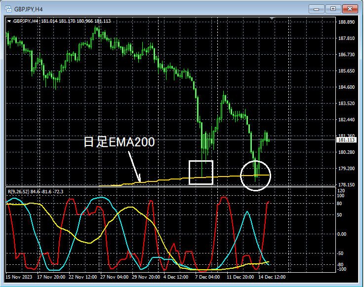 上の4時間足で白い円で囲ったあたりを見てみると、前回サポートとなった日足EMA200付近まで下げていることが分かる。いったん上昇する可能性を考えてもおかしくない場面かもしれない。