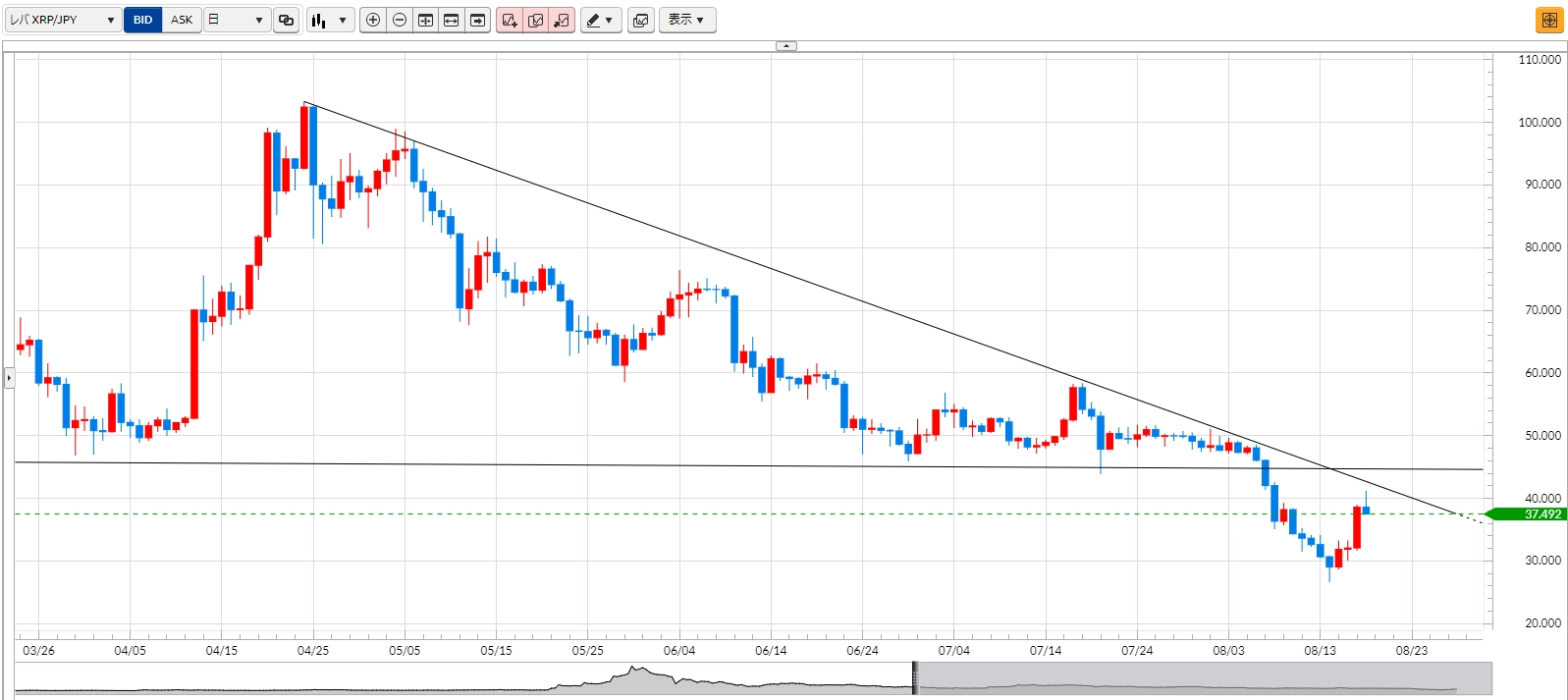 8月16日投稿の「【BTCJPY】70万円を中心に方向性を見失う展開」では、現在は70万円どころを中心として、上は75万円、下は65万円といったレンジが意識されるとお伝えしました。実際には、15日、16日、17日と3陽連をし、レンジ上限を試そうとしている流れが見られます。テクニカル的には、ダイバージェンスが発生してから、下ヒゲの陰線ができ、これらは下落の底打ち(あるいは調整波)を示唆しているように見えます。74万円~75万円どころは、前回の逆三尊のネックラインが伸びている重要水準となるので、ここを抜けるような動きがあるかどうかに注目したいところです。