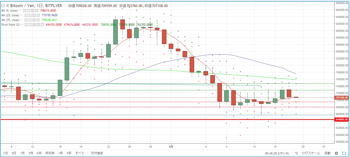 8月12日投稿の「【ETHJPY】下値更新の流れが継続」では、ボリンジャーバンドのマイナス2σに沿って、下値を更新していく強い流れは変わらず、まだまだバンドウォークを継続しそうな流れを見せていると述べました。実際に8月14日まで陰線を継続し、一時2万7000円台まで突入しました。とはいえ、そこから下ヒゲをつけて切り返し、現在はマイナス1σを上回ったところで推移。ここからミドルラインを目指せるか、再びマイナス1σを割ってしまうかに、注目したいところです。