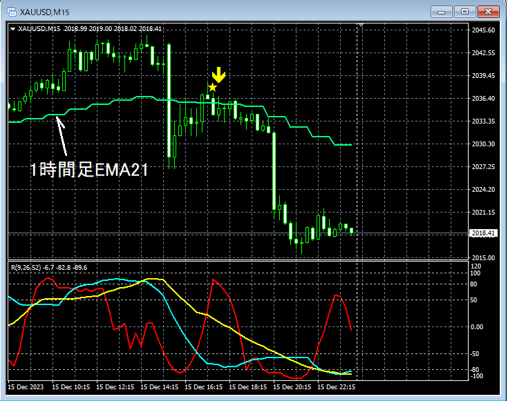 上の15分足を見てみると、1時間足EMA21を割り込んだ後の上昇でmBDSR(フィルター:RCI26とRCI52)の戻り売りサインが点灯し、プライスは順調に下げている。