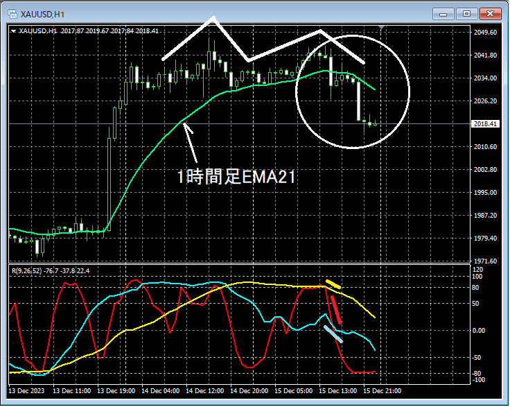 上の1時間足の白い円で囲ったあたりを見てみると、ダブルトップの右側の山を形成する可能性のある形をしており、サポートとなっていた1時間足EMA21を割り込んでいて、さらにRCI3本ラインがそろって下げのとても弱い形をしていることが分かる。下位足で戻り売りを考えてもおかしくない場面かもしれない。
