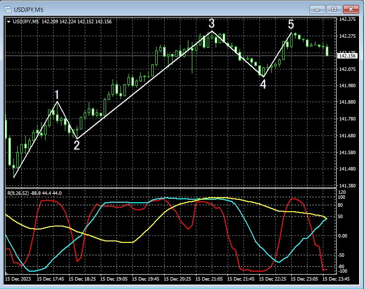 上の1時間足で白い円で囲ったあたりを見てみると、RCI3本ラインがそろって下げのとても弱い形をしていることが分かる。なお、チャートは省略するが、下位足の15分足と5分足ではダウ理論からは下落トレンドである。さらに下位足の1分足で戻り売りを考えてもおかしくない場面かもしれない。