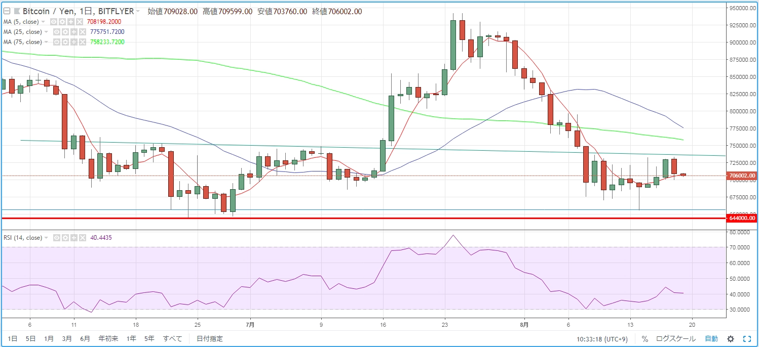 画像は2018年8月19日のキャプチャ。ここ最近で猛烈に下げては、調整を挟み、さらに下げるという流れを繰り返しています。ビットコインキャッシュ、イーサリアム、リップルなどは、5%~10%にもおよぶ変動率を見せることもしばしばあります。