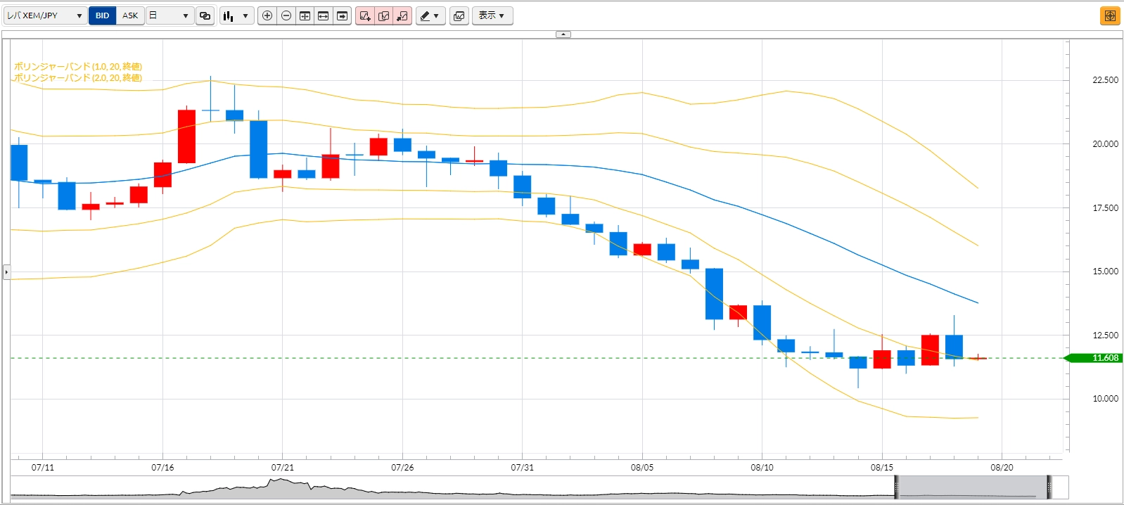 8月18日投稿の「【BTCJPY】下ヒゲをつけてから3陽連を継続」では、15日、16日、17日と3陽連をし、前回の逆三尊のネックラインが伸びている重要水準を攻めようとする動きがありそうだと述べました。実際には、17日の高値をわずかに上回るのが限界で、そこからは17日の上昇分をはき出す形の陰線を形成。ここ最近の相場水準である約70万円どころまで戻っています。14日の下ヒゲ、15日の上ヒゲが物語るように、現在は方向性が読みづらい状況です。