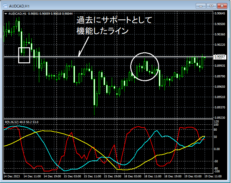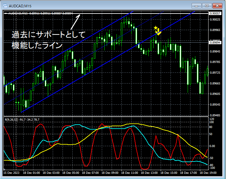 この例から、平行チャネルに注目したトレード手法や過去のサポートラインに注目したトレード手法とmBDSRのサインとの親和性の高さがうかがえる。