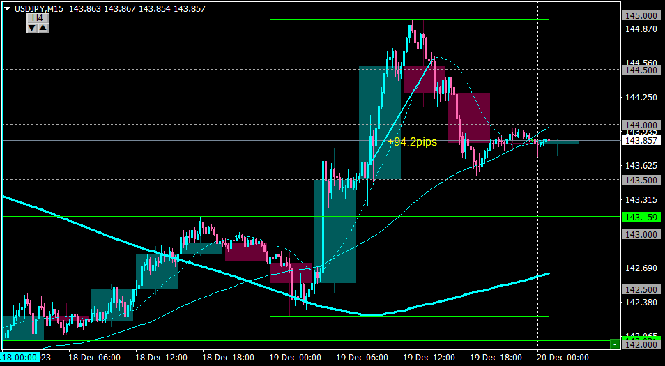 〇前日のトレード・USDJPY ドル円(15分足)昨日は午前中に要人発言のためか急騰。いったん下値を試す長い下ヒゲを確認後にロング。+94.2pips・EURUSD ユーロドル(15分足)昨日はロング