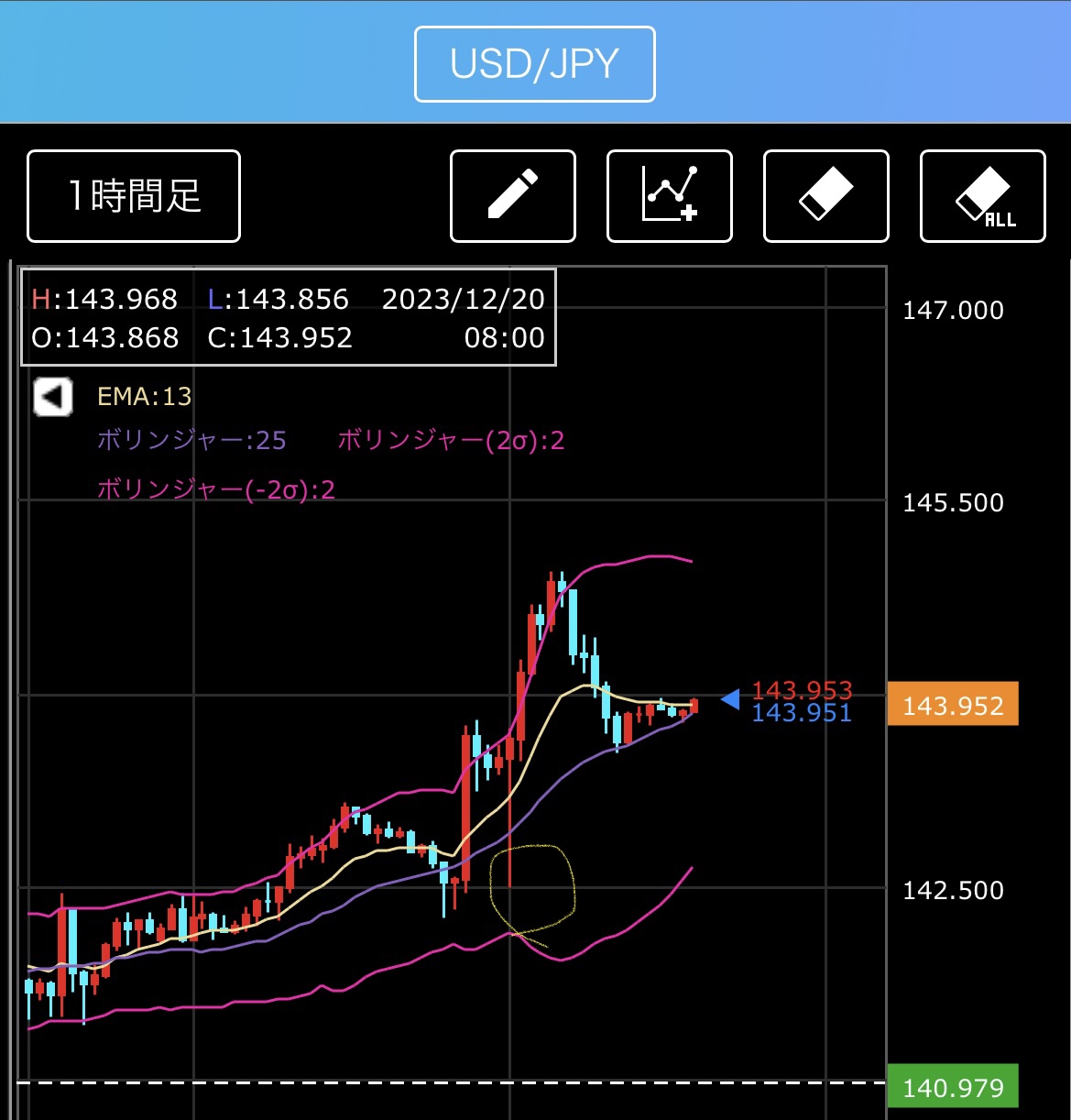 こちらは、ドル円1時間足チャートですが、億トレーダーのスキャルピングユーザーの皆様は、普段見ている1分足チャートを1時間足チャートに置き換えて見てください。