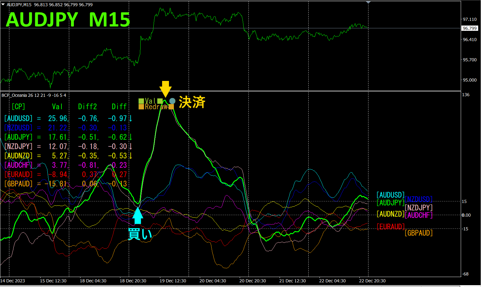 上半分は、AUDJPYの15分足チャートです。下半分は、「8CP見える化インジケータ」によるものです。緑色太線のグラフがAUDJPY に相当します。
