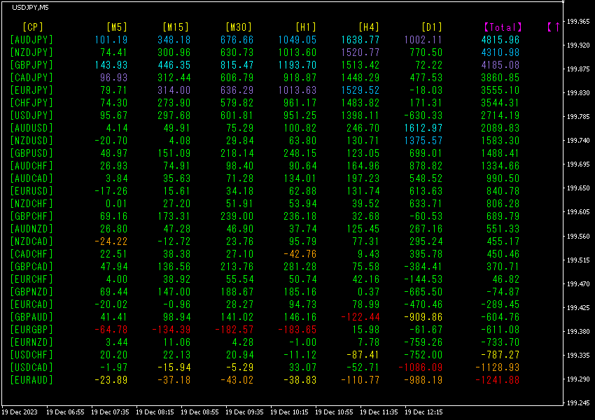 Total数値の降順に並び替えています。最も上の行にあるAUDJPYは、全ての時間足で青色系の表示色になっていて、Total数値が+4815.96と大きなプラスの数字になっています。AUDJPYに大きな上昇トレンドが発生していることを示しています。