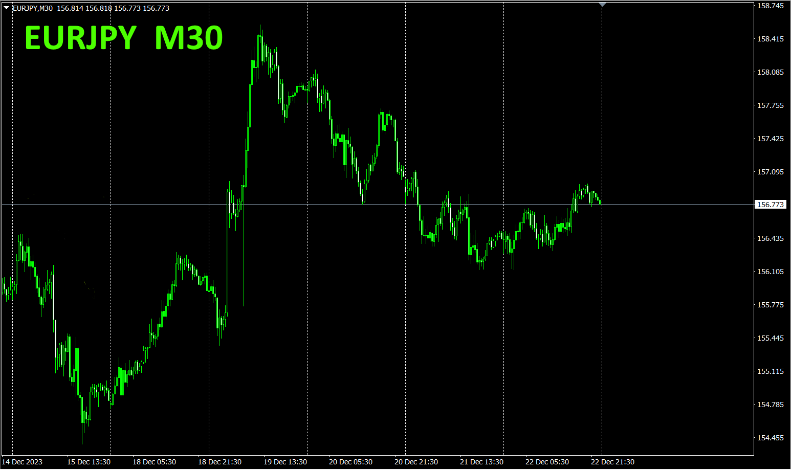 全体の流れを見るため、30分足チャートで直近約3週間分を描いています。