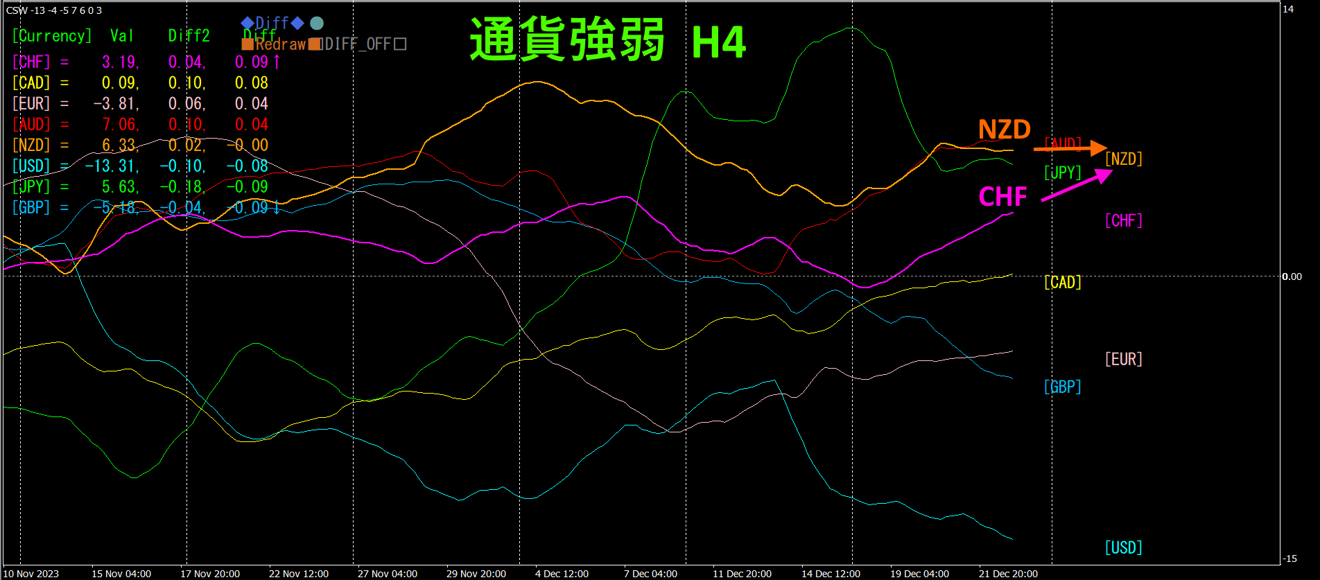 4時間足の通貨強弱チャートを参照します。