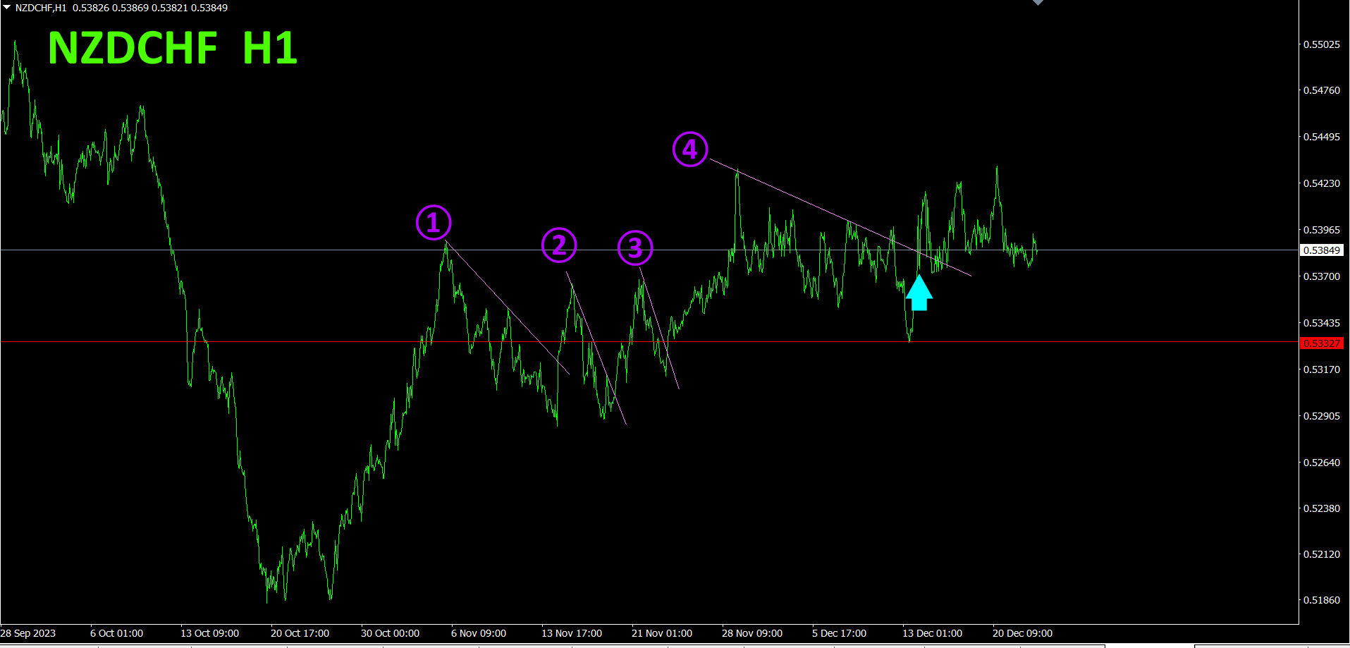 2505「天底Searchインジケータ」を使い、大底に位置する通貨ペアとしてNZDCHFを選択しました。大底からの上昇を狙います。