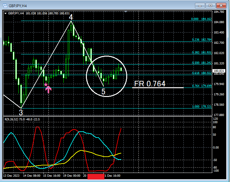 上の4時間足を見てみると、エリオット波動の第4波と想定している上昇の途中でmBDSR(RCI2本フィルター)の押し目買いサインが点灯している。白い円で囲ったあたりを見てみると、その後の第5波と想定している下げでフィボナッチリトレースメント76.4%付近まで下げている。また、短期RCIであるRCI9は底値圏で張り付いている(赤い四角のあたり)。下位足で上昇の兆候があれば、押し目買いを考えてもおかしくない場面かもしれない。