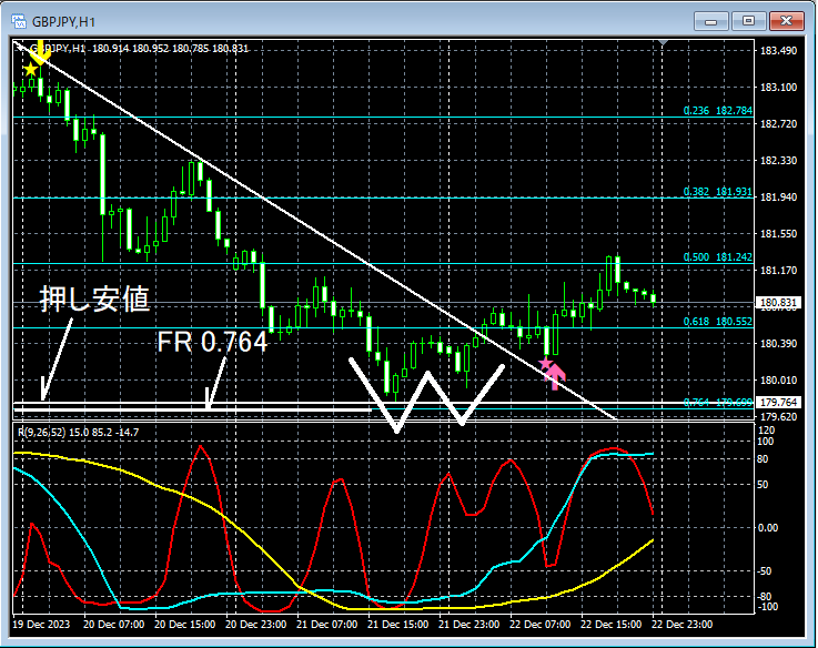 上の1時間足を見てみると、4時間足のエリオット波動の第5波と想定している下げの初期にmBDSR(RCI2本フィルター)の戻り売りサインが点灯している。 フィボナッチリトレースメント76.4%と押し安値(ダウ理論)と付近まで下げたあたりを見てみると、RCI3重底の形(緑色の四角のあたり)まで下げている。その後、反発。ダブルボトムを形成して上昇してカウンタートレンドラインを上抜けしている。そして、少し下げたところでmBDSR(RCI2本フィルター)の押し目買いサインが点灯し、プライスは上昇している。