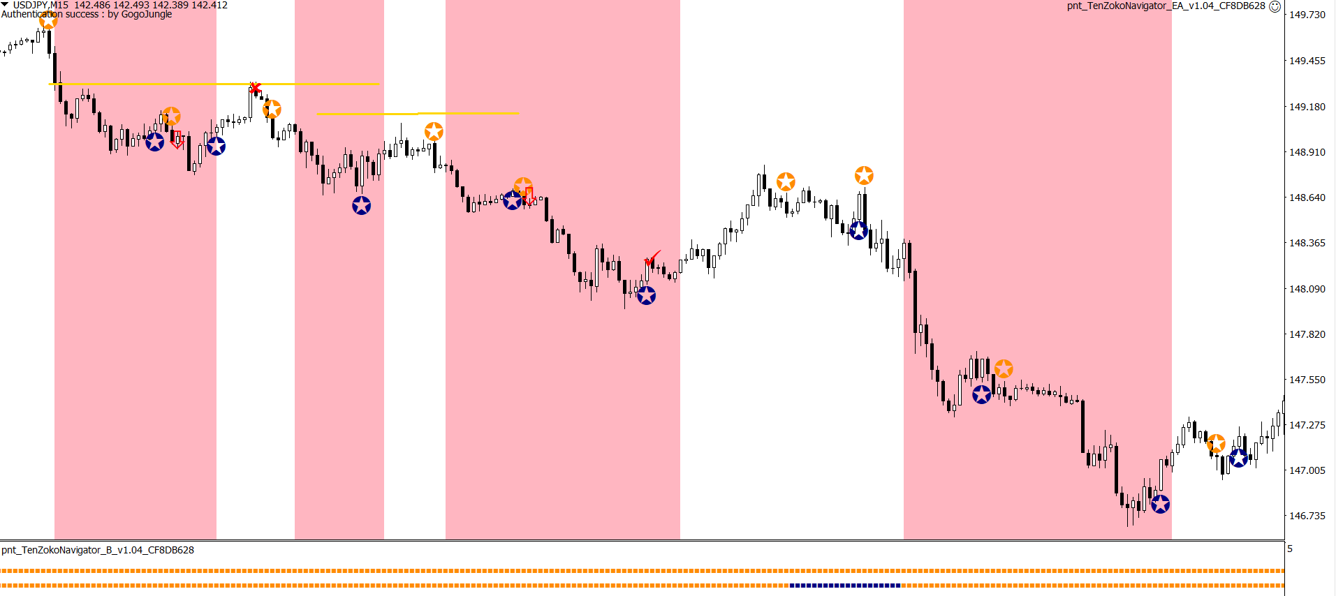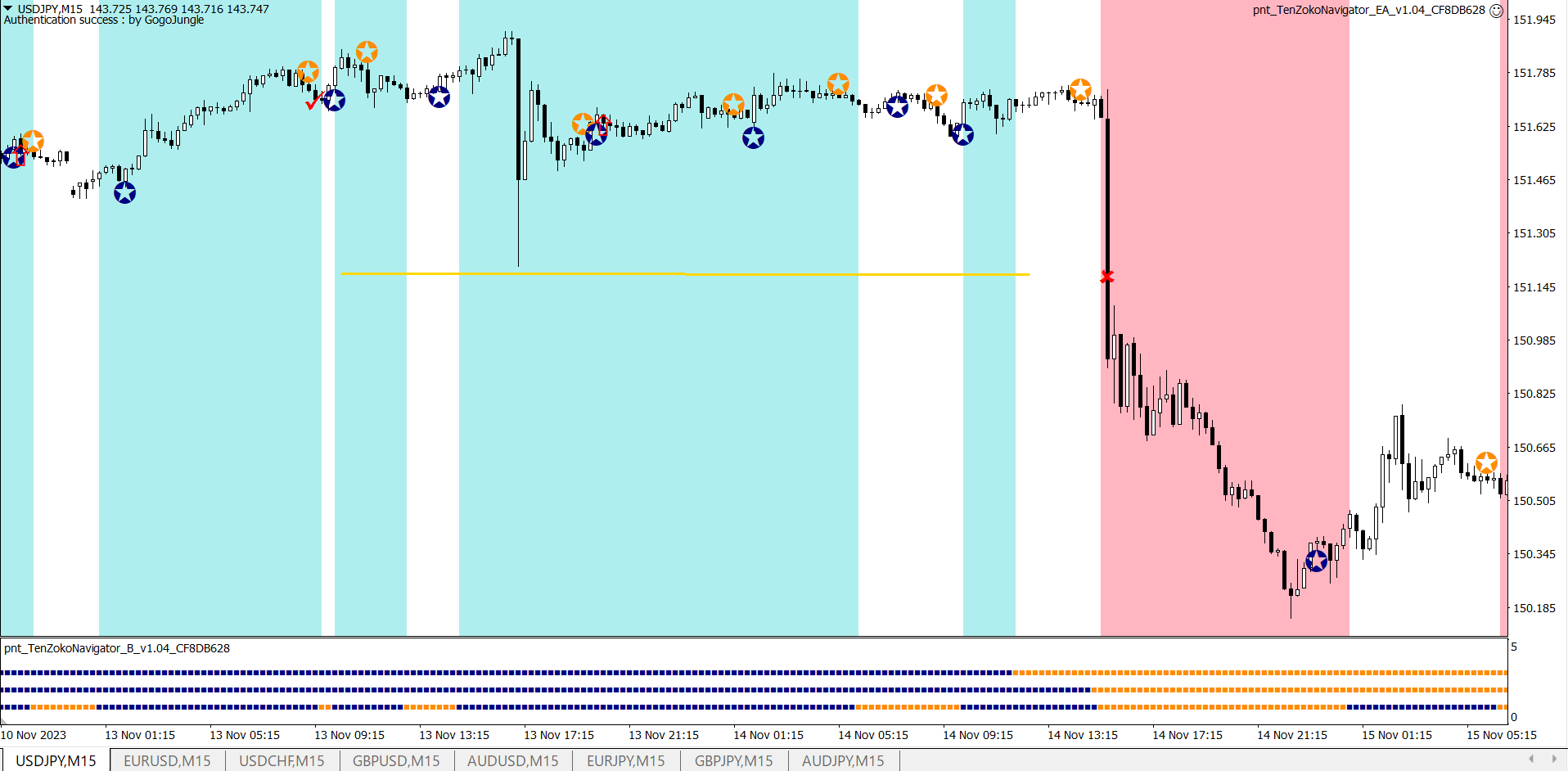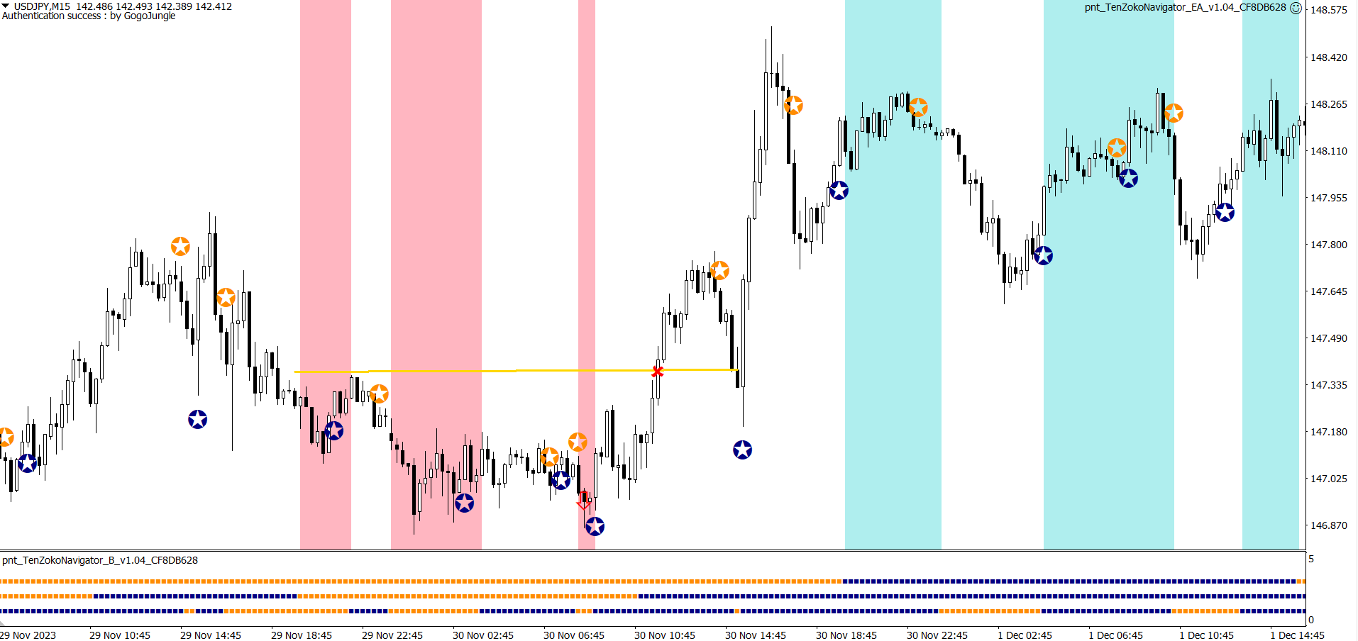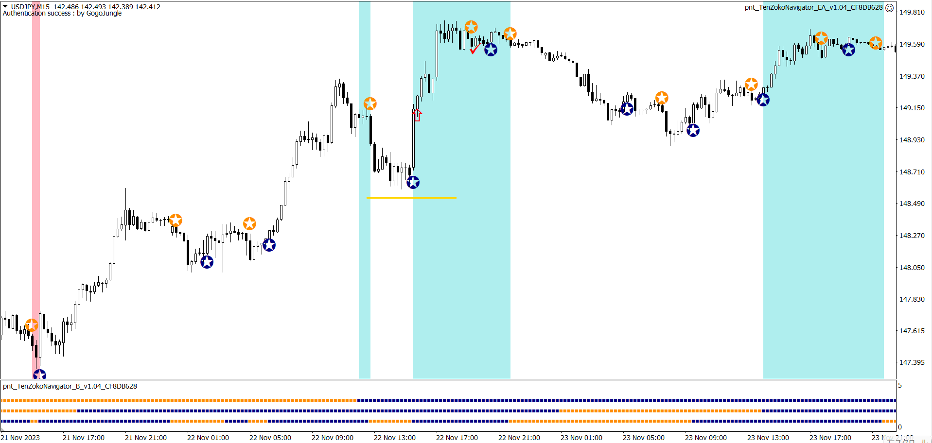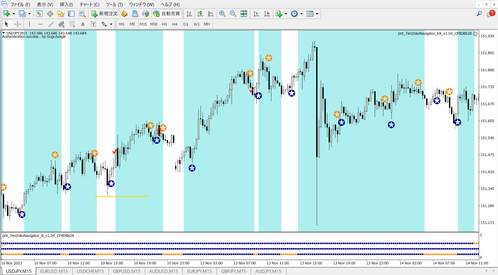 ※上昇が続く中での★サインでの利確。自動利確EAは利益が出ているときに逆のサインが出ると決済します。