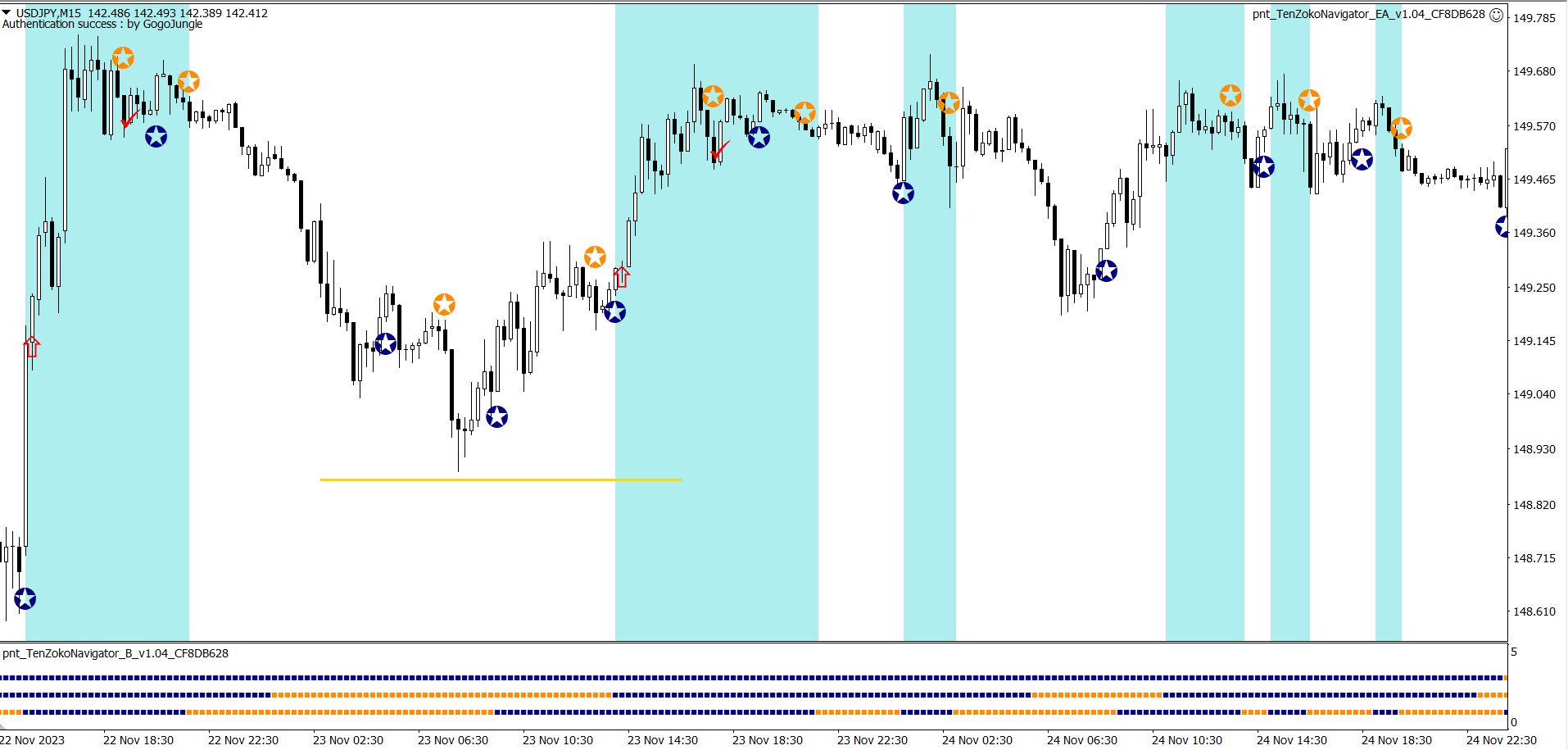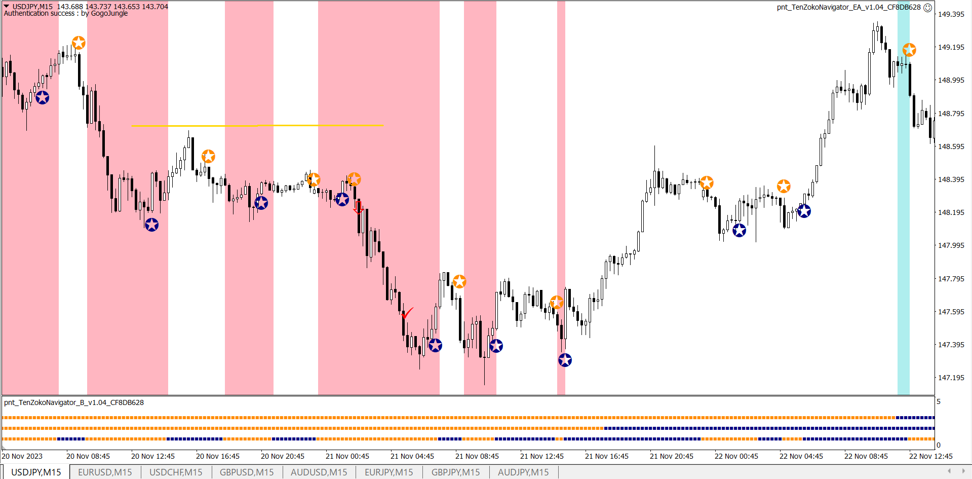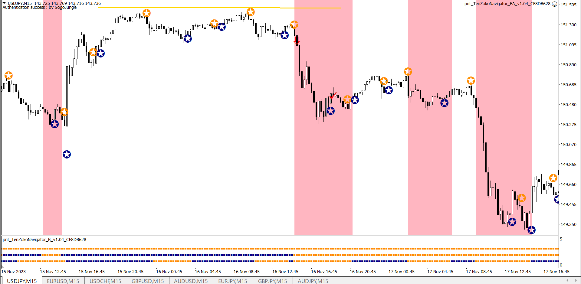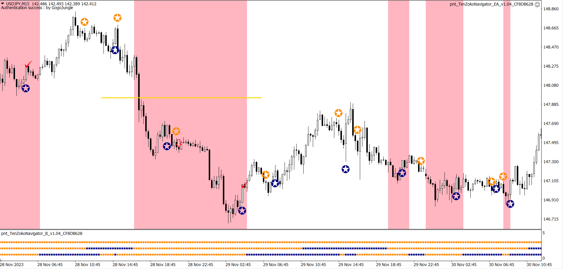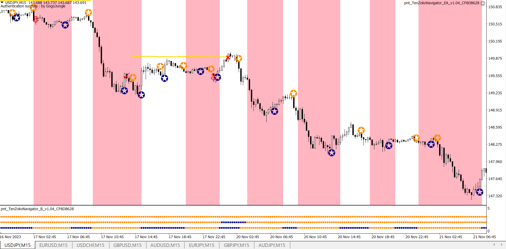 ※上昇が続く中での★サインでの利確。自動利確EAは利益が出ているときに逆のサインが出ると決済します。