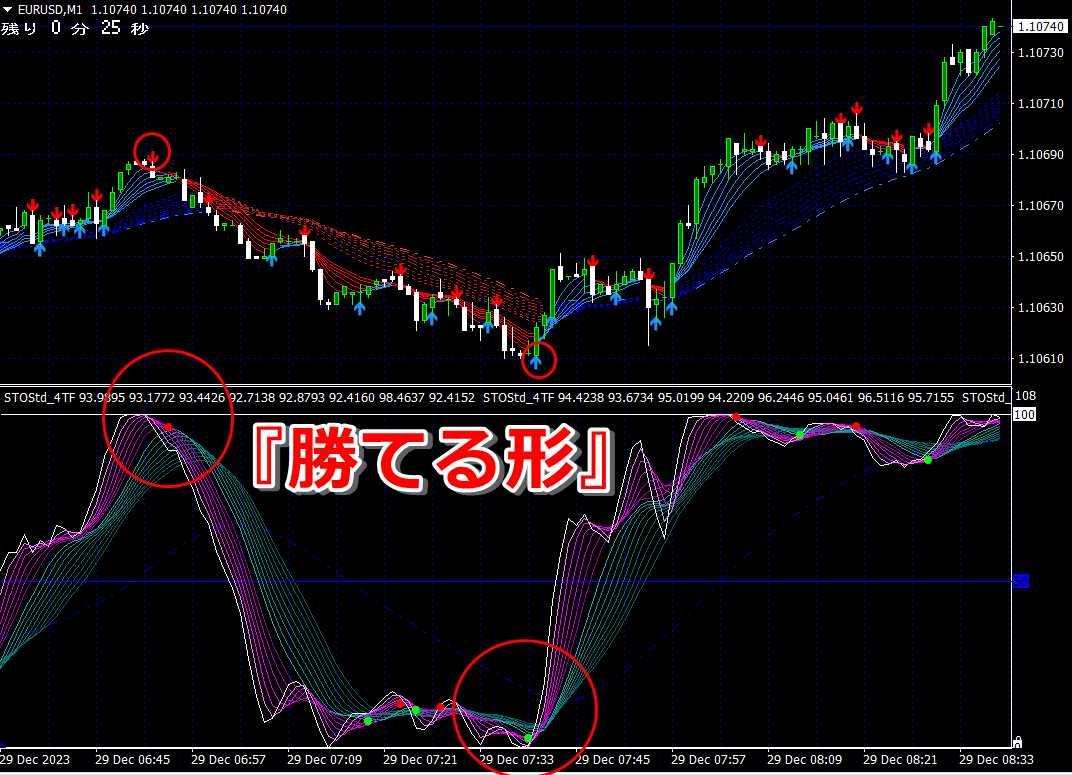 ② 矢印サイン点灯状態で、インジケーターのピンク色の帯が、緑の帯を下からすくい上げるような形状であれば、現在のローソク足が確定する数秒前か確定の直後に1分判定または3分判定でハイエントリーします。
