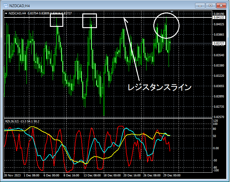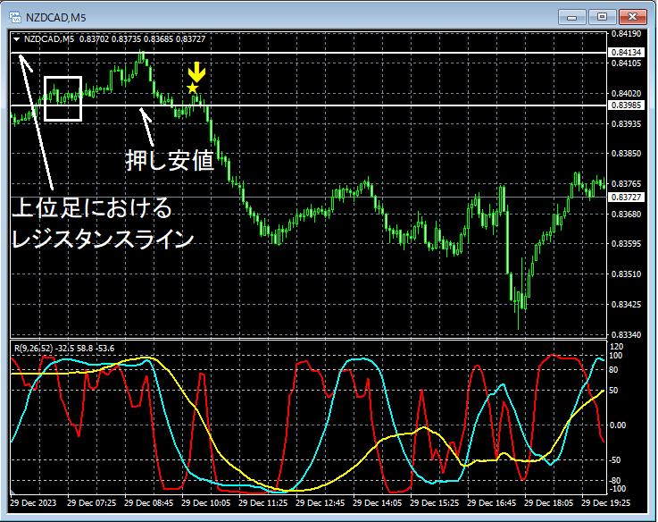 レジスタンスラインと押し安値とmBDSR(RCI2本フィルター)の戻り売りサイン