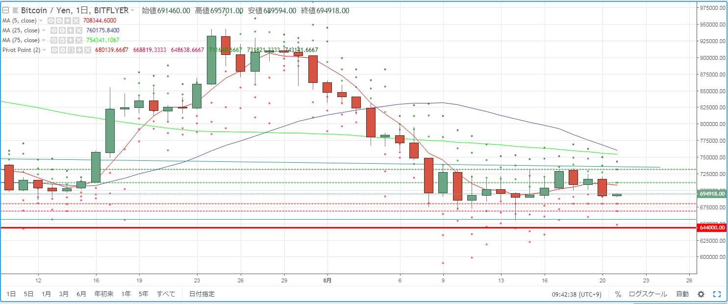 画像は2018年8月22日のキャプチャ。最近は大きく下げては、少し戻るというリズムで、下降トレンドを描いている仮想通貨全般。今日は「緑」の表情を見せてスタートしています。