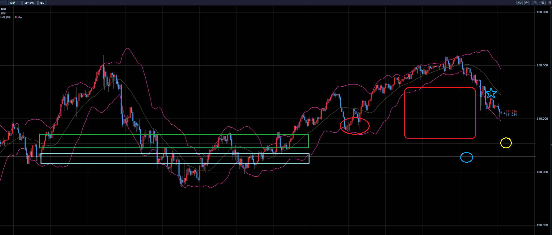 億トレーダーのスキャルピング日足チャートで見える一旦のゴールは青〇ライン