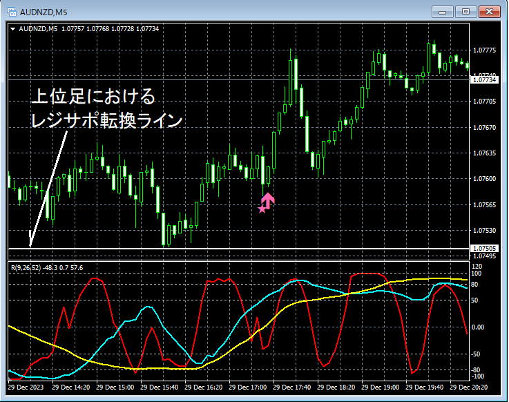 上の5分足では、上位足のレジサポ転換ライン付近で反発。そして、mBDSR(フィルター:RCI26とRCI52)の押し目買いサインが点灯し、その後、プライスは順調に上昇している。