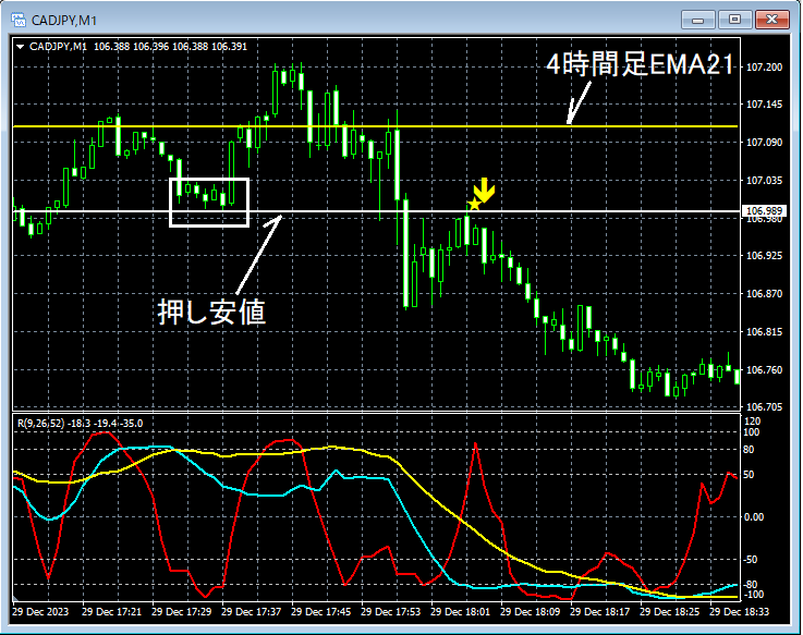上位足の状況については省略。上の1分足では、注目していた4時間足EMA21をしっかりと上抜けすることができず反落。そして、押し安値を示すラインを割り込んでいる。そのライン付近まで上昇したところでmBDSR(フィルター:RCI26とRCI52)の戻り売りサインが点灯し、その後、プライスは順調に下げている。