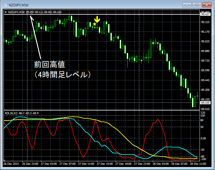 上の30分足を見てみると、上位足における前回高値を示すライン付近まで上昇した後、mBDSR(RCI2本フィルター)の戻り売りサインが点灯している。そして、その後、プライスは大きく下げている。