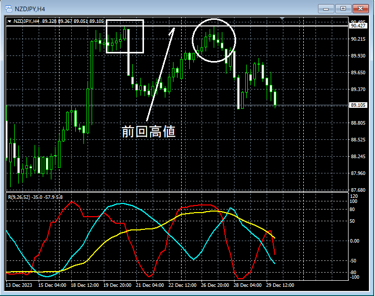 上の4時間足で白い円で囲ったあたりでは、前回高値付近まで上昇しており、いったん少し下げる可能性があると考えてもおかしくない場面かもしれない。