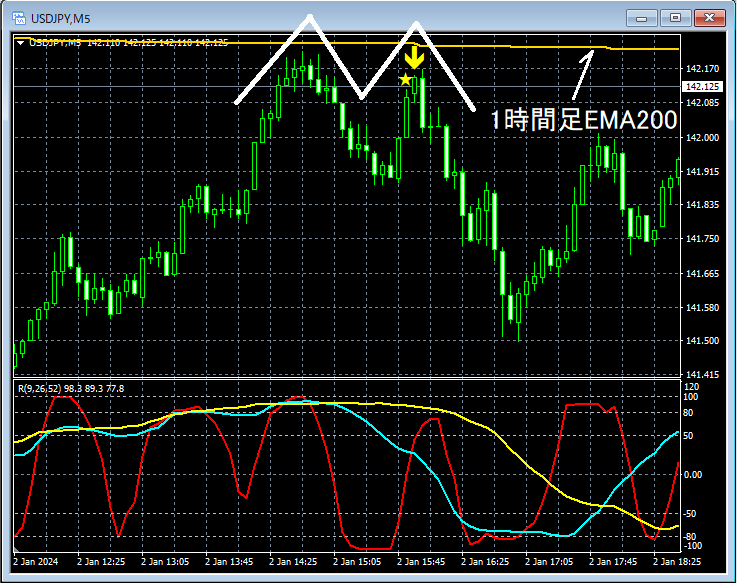 上の5分足では、1時間足EMA200付近まで上昇したところでmBDSR(フィルター:RCI26とRCI52)の戻り売りサインが点灯し、その後、プライスは順調に下げている。