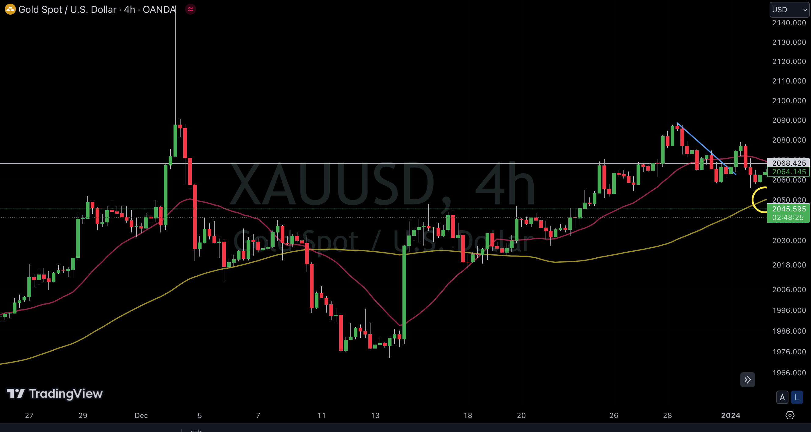 4時間足、下げるなら下側白ライン節目までのスペースあり。黄色丸あたりのスペースを埋めにくる調整が入ってくるか。