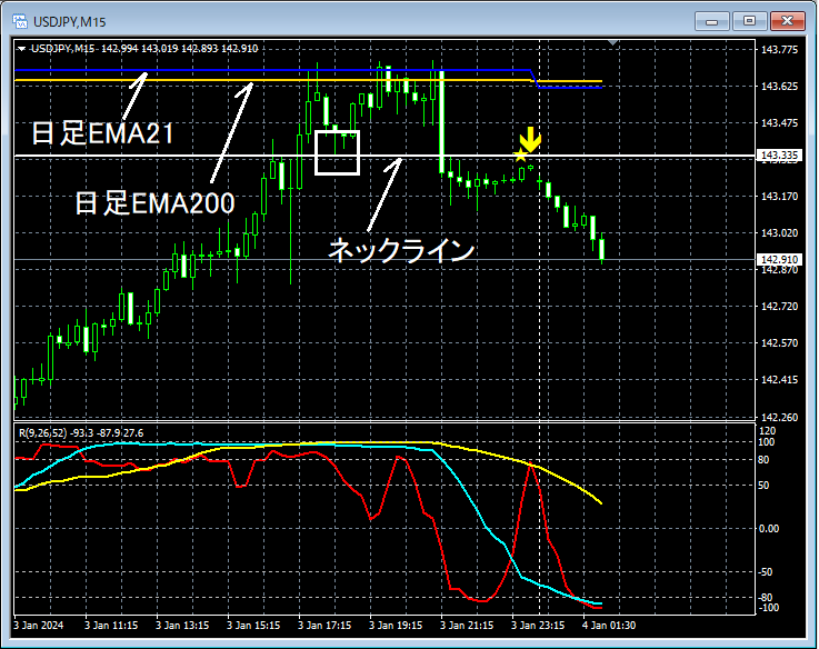 上位足の状況については省略。上の15分足では、注目していた日足EMA21と日足EMA200が重なるあたりまで上昇後、反落。そしてネックライン割れ。そのネックライン近くまで上昇したところでmBDSR(フィルター:RCI26とRCI52)の戻り売りサインが点灯し、その後、プライスは順調に下げている。