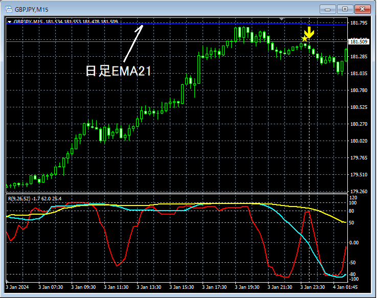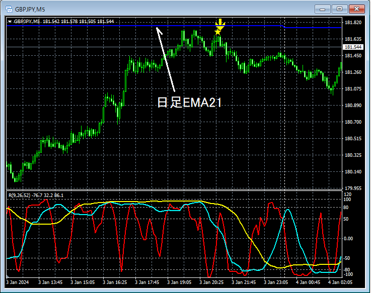 上位足の状況については省略。上の5分足では、注目していた日足EMA21付近まで上昇したところでmBDSR(フィルター:RCI26とRCI52)の戻り売りサインが点灯し、その後、プライスは順調に下げている。