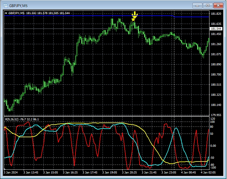 上の5分足では、4時間足でピンバーが発生した後、mBDSR(フィルター:RCI26とRCI52)の戻り売りサインが点灯し、その後、プライスは順調に下げている。