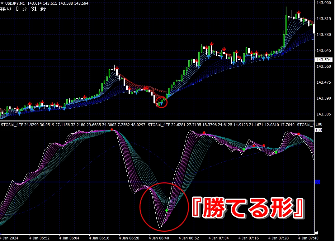 ② 矢印サイン点灯状態で、インジケーターのピンク色の帯が、緑の帯を下からすくい上げるような形状であれば、現在のローソク足が確定する数秒前か確定の直後に1分判定または3分判定でハイエントリーします。