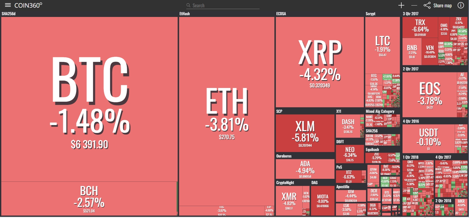 coinmarketcap(コインマーケットキャップ)のサイトから、ドミナンス(各銘柄が仮想通貨全体の時価総額に占めるパーセンテージ)を定点観測していきます。仮想通貨全般が下方向に大きく動き出している相場状況を受け、毎日更新することとし、仮想通貨業界を俯瞰および転換期を早期に発見することを目的とします。