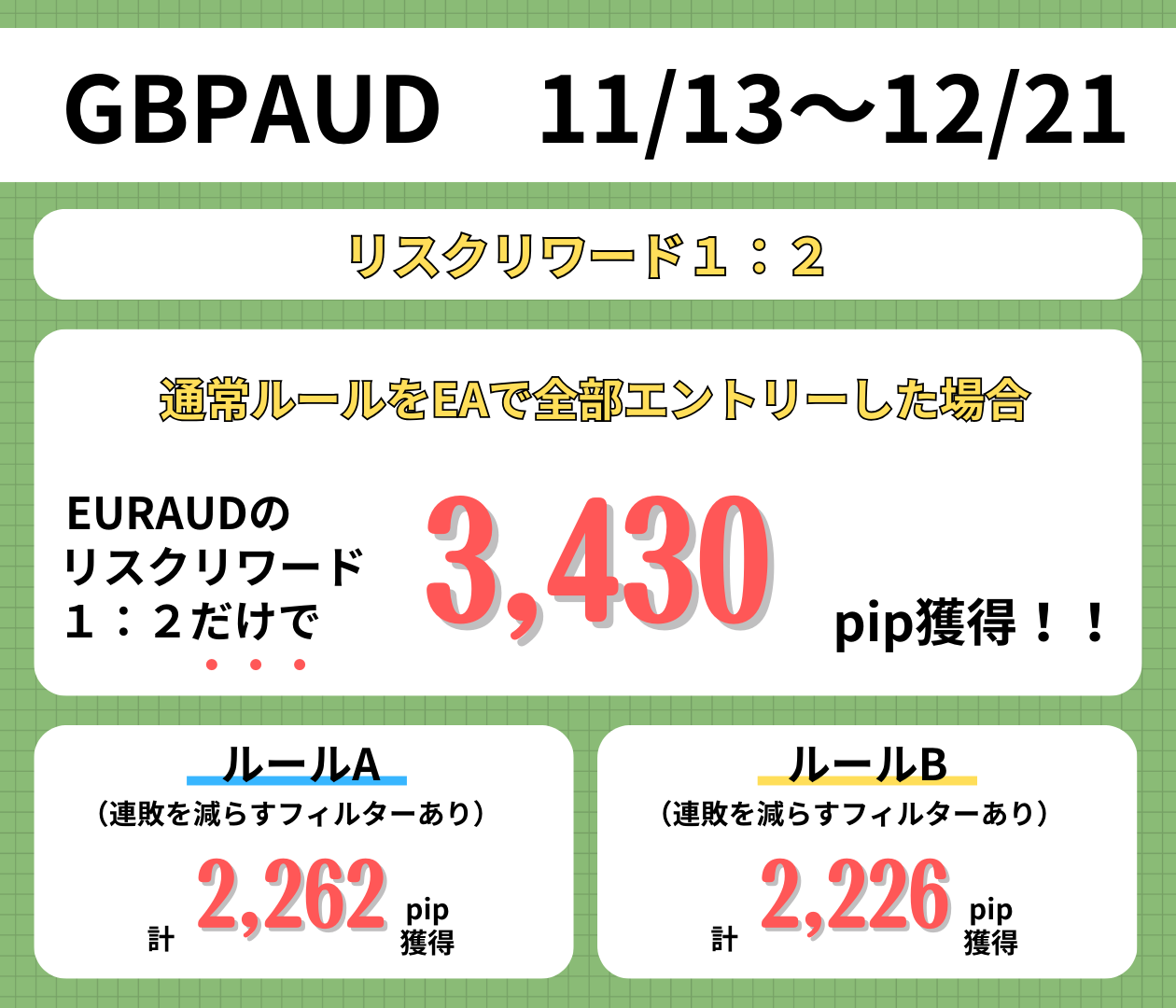 対照的に12日火曜日はGBPAUDが爆益という、バランスのとれた通貨ペアとなっています。