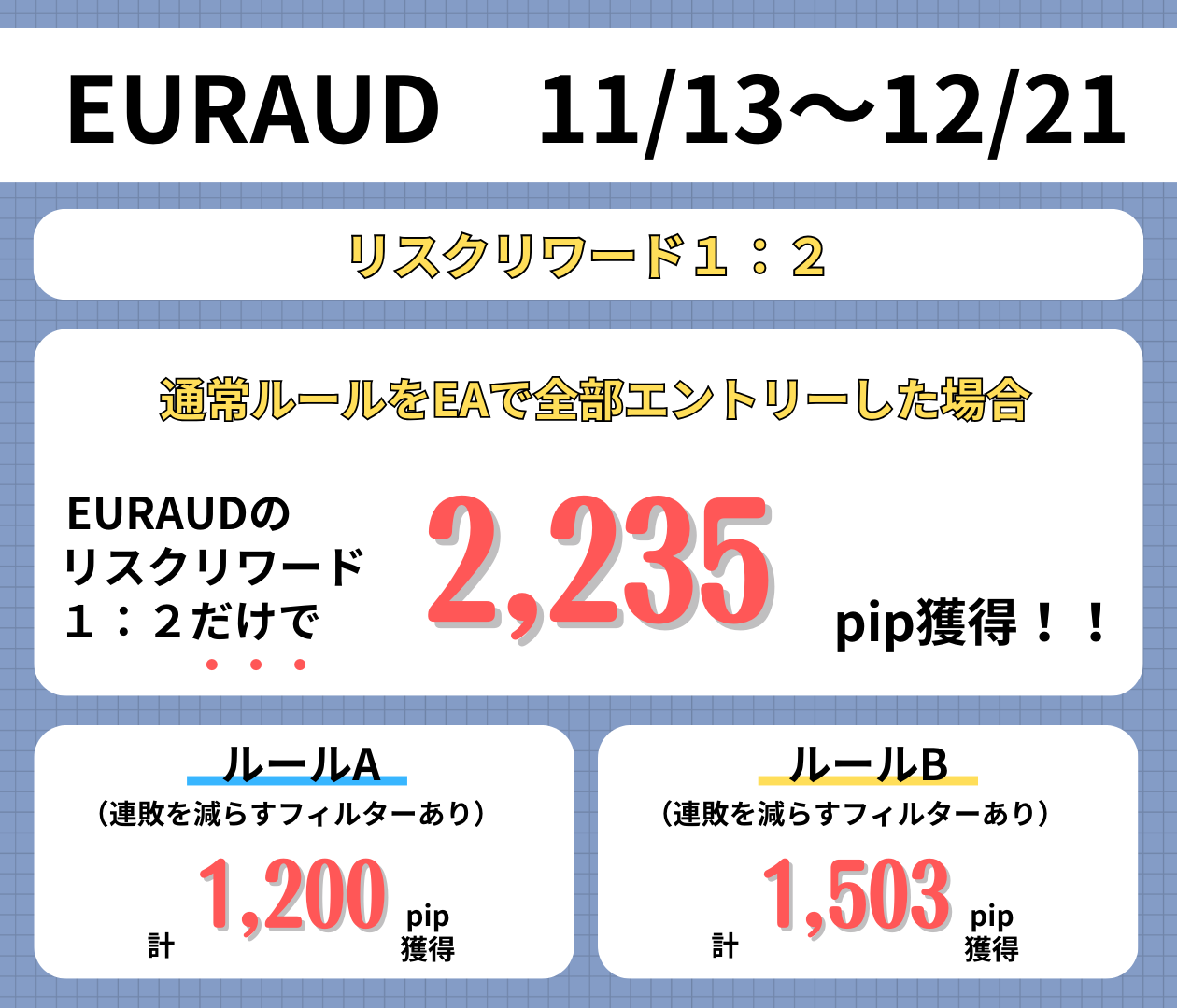 こちらはEAを使って全エントリーできた場合の数字ですので、手動でエントリーと利確損切を設定しているとやはり間に合わずチャンスを逃してしまいます。