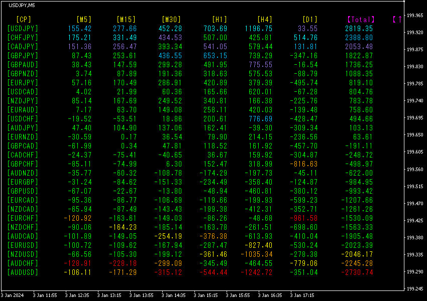 Total数値の降順に並び替えています。最も上の行にあるUSDJPYは、全ての時間足で青色系の表示色になっていて、Total数値が+2819.35とプラスの数字になっています。USDJPYに上昇トレンドが発生していることを示しています。