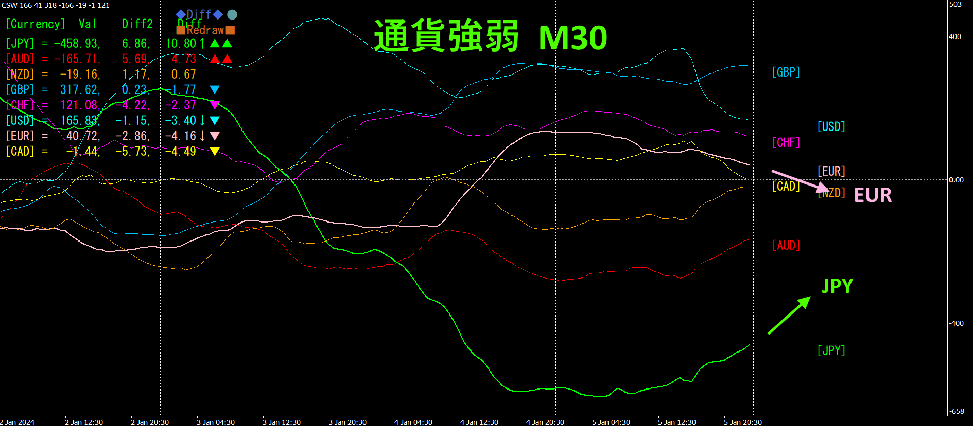 ピンク色がEUR、緑色がJPYです。JPYは上向き、EURは下向きで、収束する方向に進んでいますので、EURJPYは下落すると考えられます。
