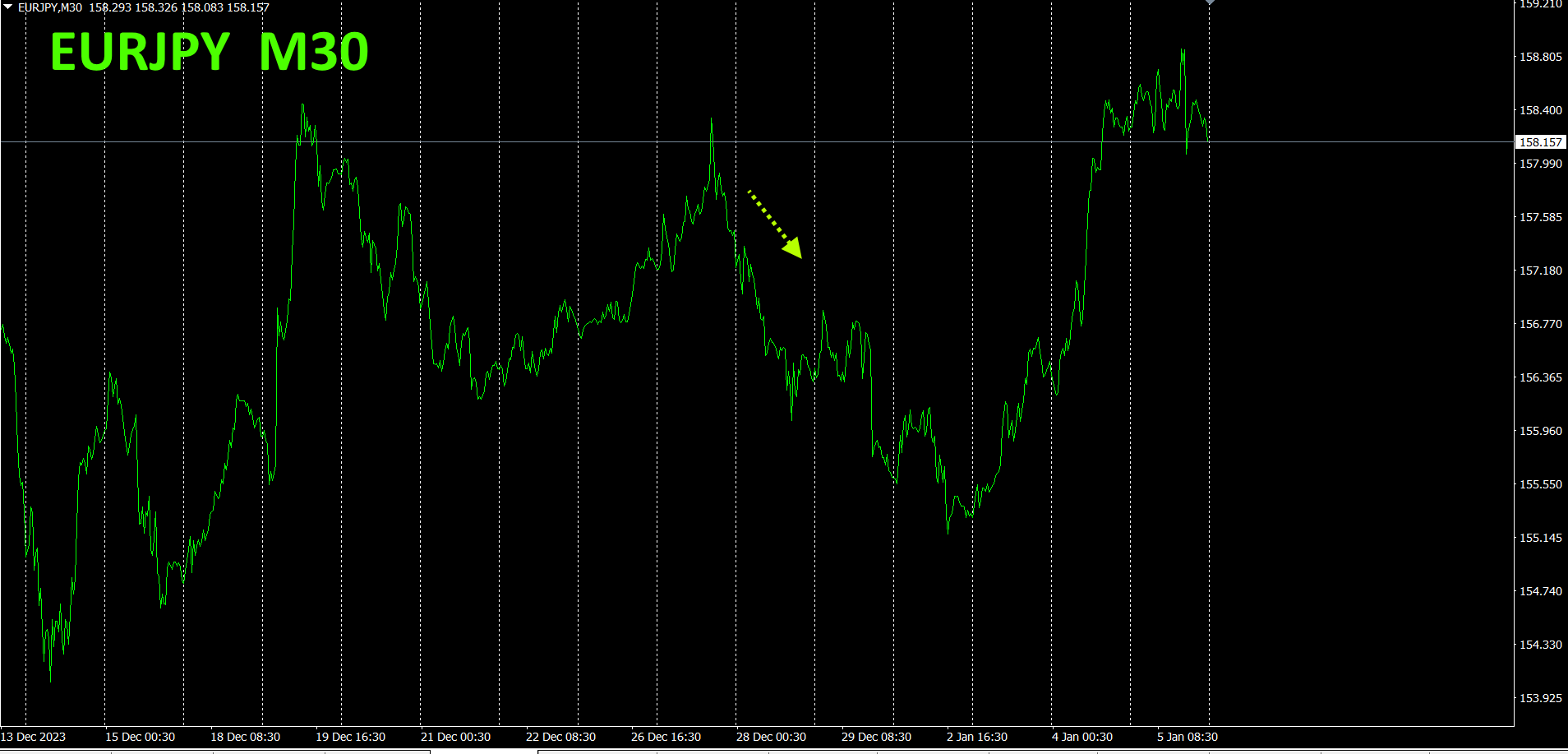JPYは上向き、EURは下向きで、乖離する方向に進んでいますので、EURJPYは下落すると考えられます。