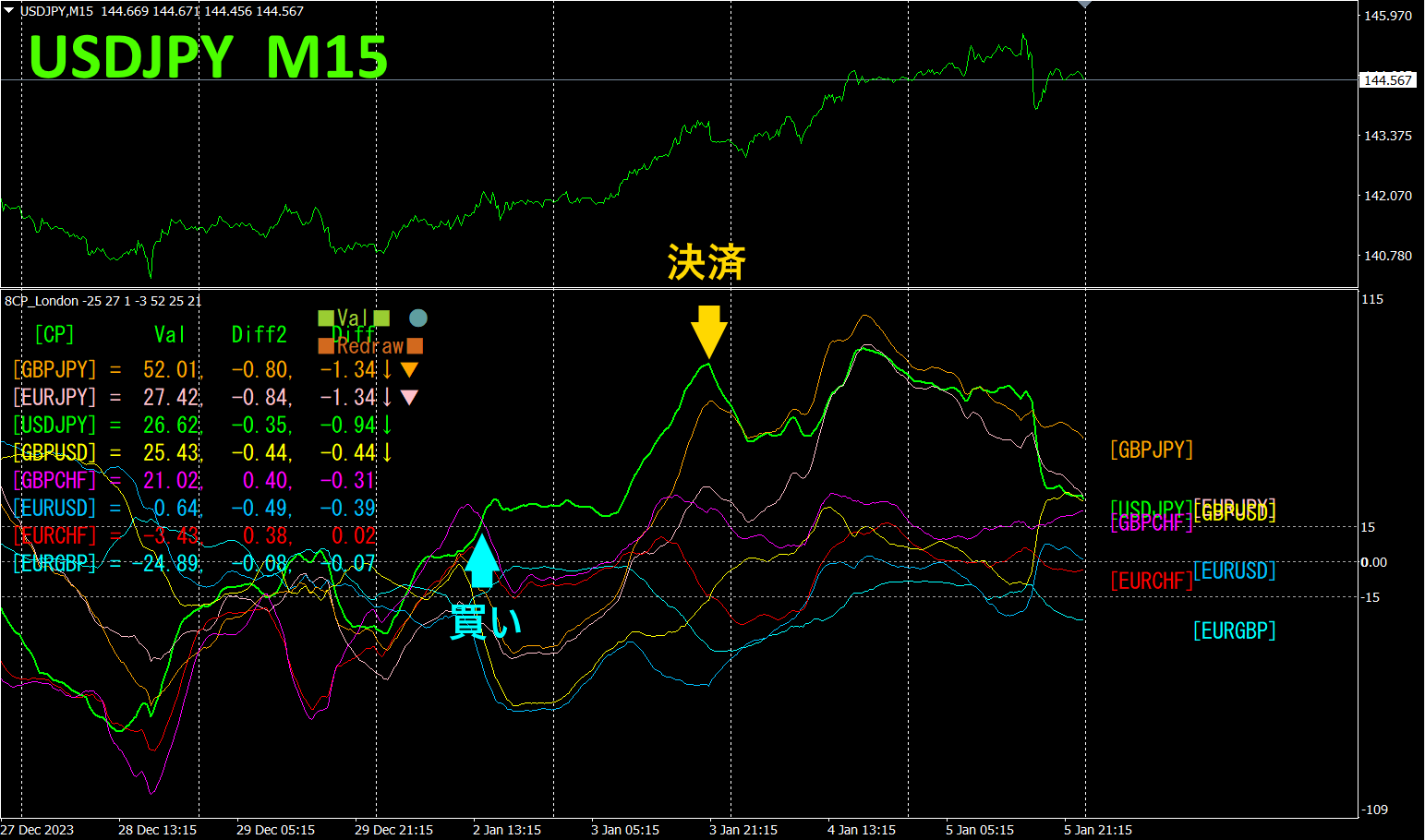 上半分は、USDJPYの15分足チャートです。下半分は、「8CP見える化インジケータ」によるものです、緑色太線のグラフがUSDJPY に相当します。