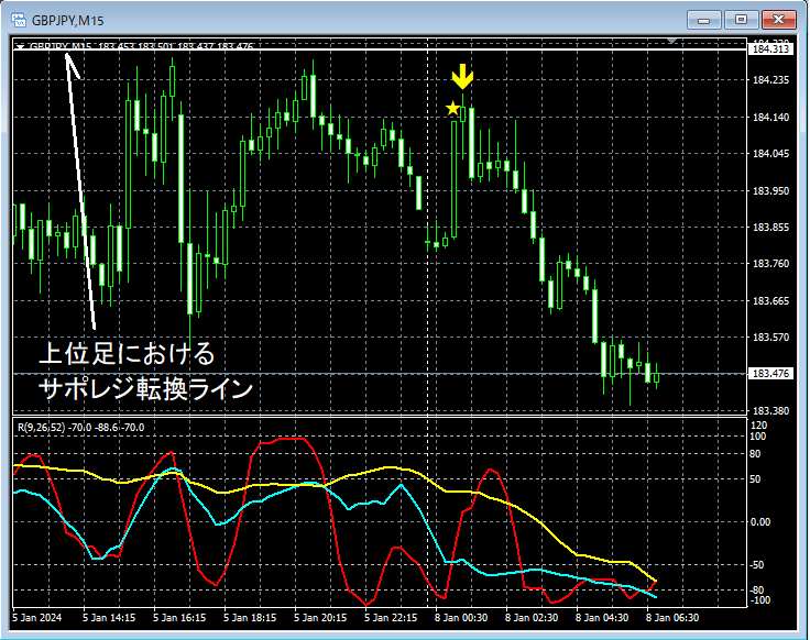ポンド円:サポレジ転換ラインとmBDSR(RCI2本フィルター)の戻り売りサイン