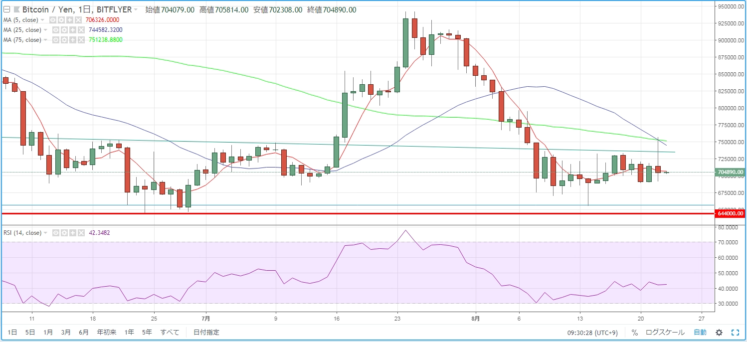 BTCJPYでデイトレする目安として、ピボットを確認します。昨日(8月22日)は、一時75万円を突破する上昇を見せたものの、そこから押し戻される形で長い上ヒゲの陰線を形成した相場環境でした。