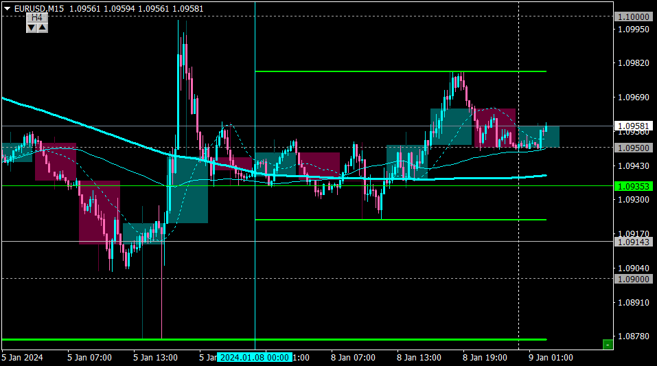 〇前日のトレード・USDJPY ドル円(15分足)昨日は先週安値141.50付近での値動きにとどまったためノートレード。・EURUSD ユーロドル(15分足)昨日は1.090付近でのプライスアクション