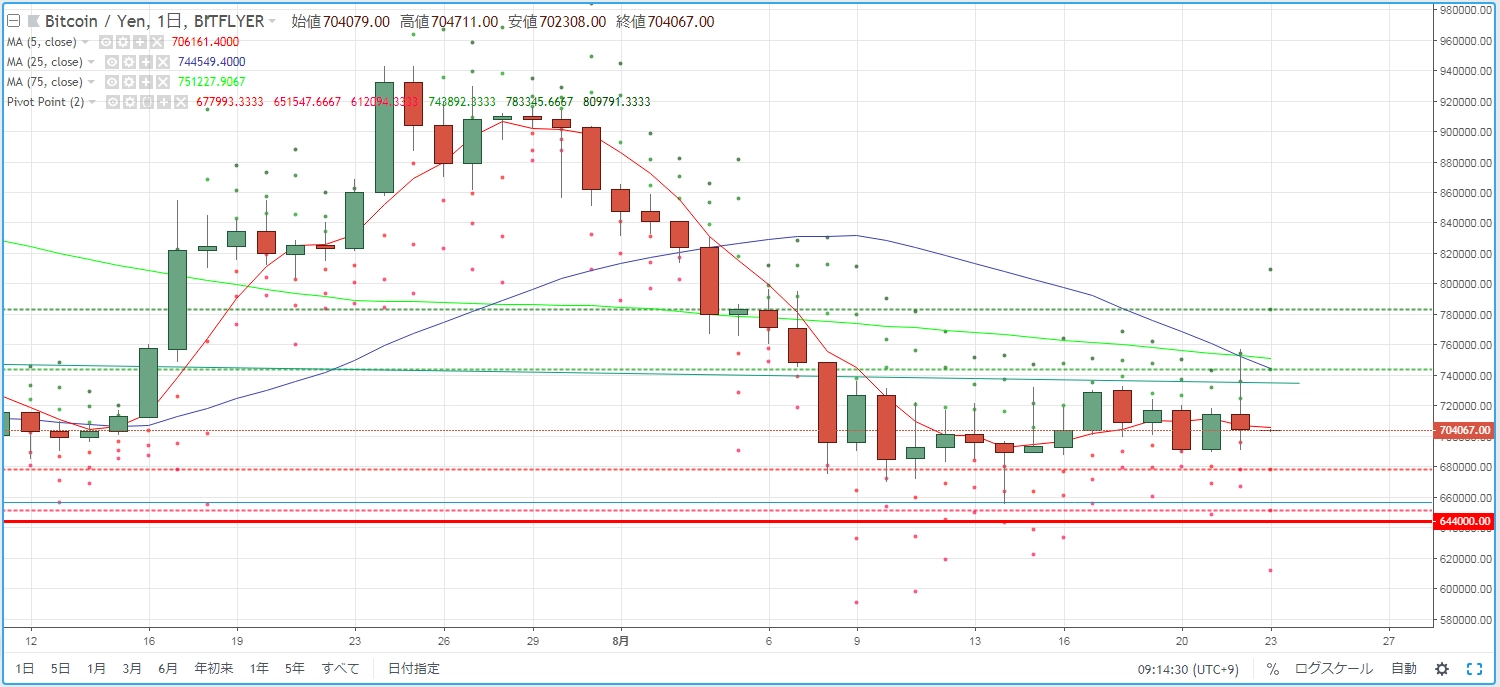 画像は2018年8月24日のキャプチャ。仮想通貨全般で調整の上昇が見られます。ここ最近は調整の後にすぐ下落が始まるサイクルが繰り返されています。「緑」が継続できるかに注目です。