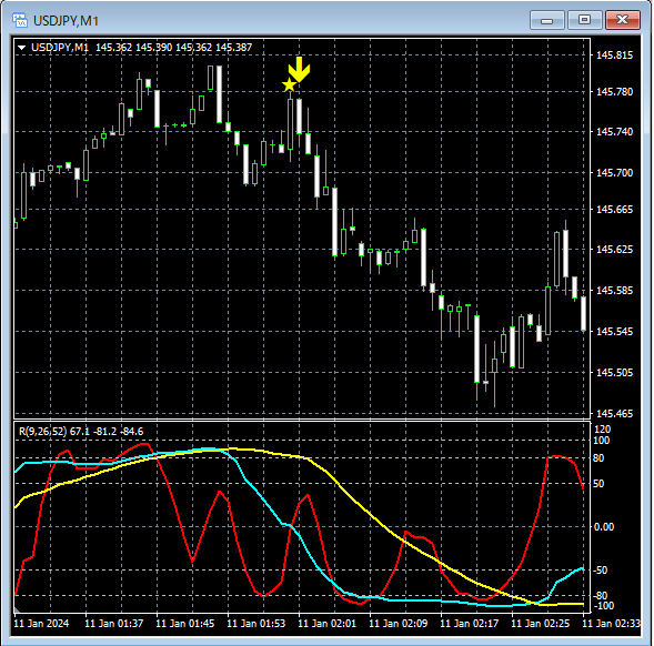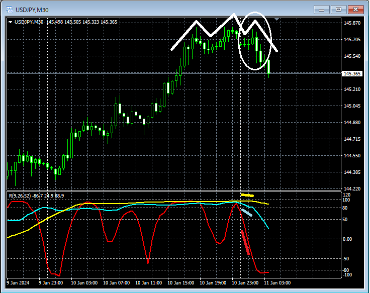 本日のドル円チャート(2024年1月11日):上位足における三尊とRCI3本ラインとmBDSR(RCI2本フィルター)のサイン