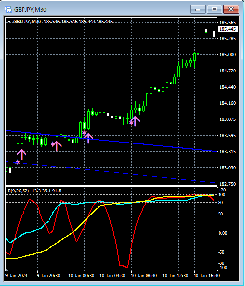 上の30分足では、上昇フラッグの上値抵抗線を上抜け前後にR1R2S2の押し目買いサインが数回点灯していることも分かる。特に、上昇フラッグの上値抵抗線を上抜けした直後にR1R2S2の押し目買いサインが点灯し、その直後からプライスは順調に上昇している点に注目している。