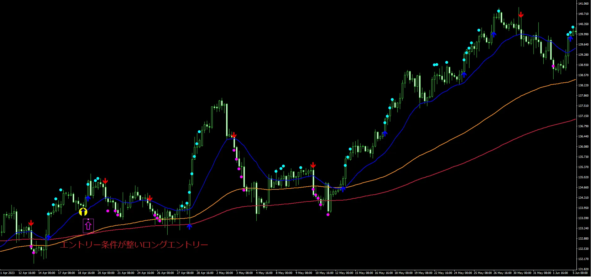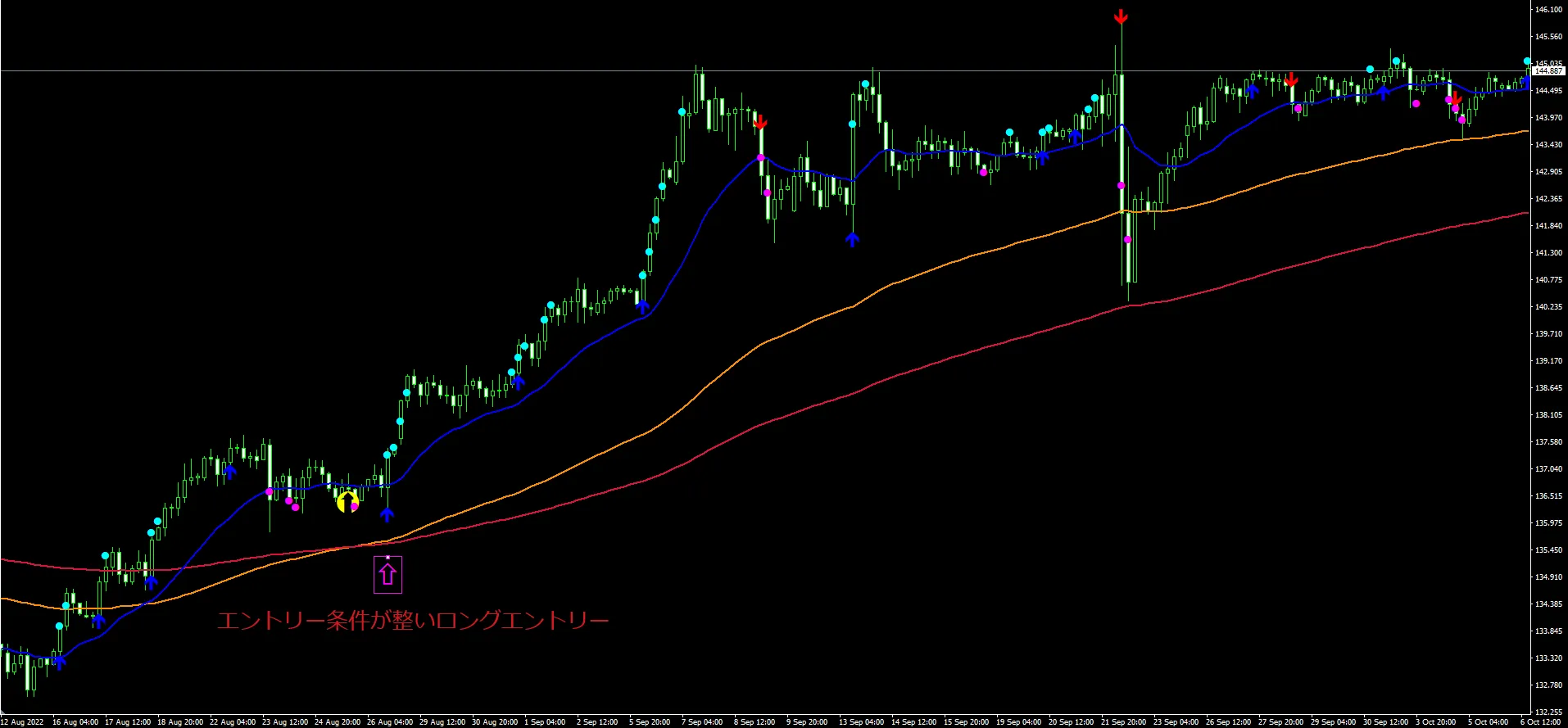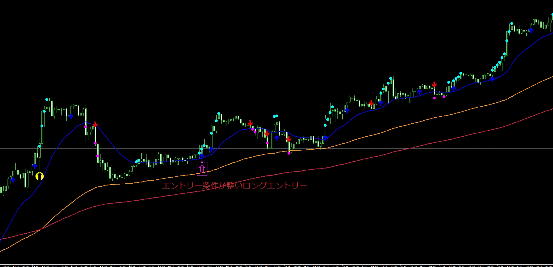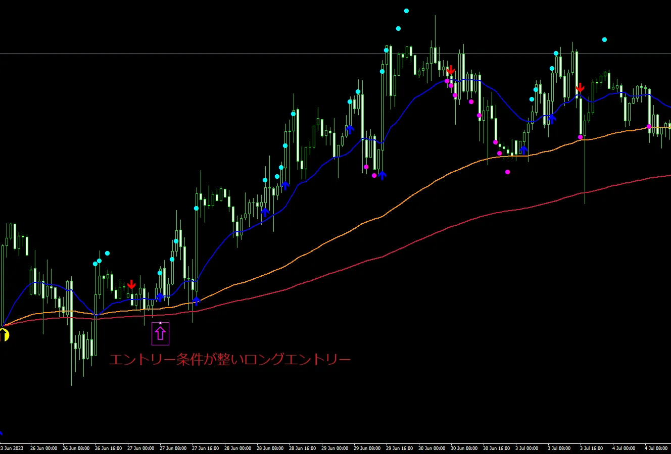 ピンクの中抜き矢印のローソク足でエントリー条件成立