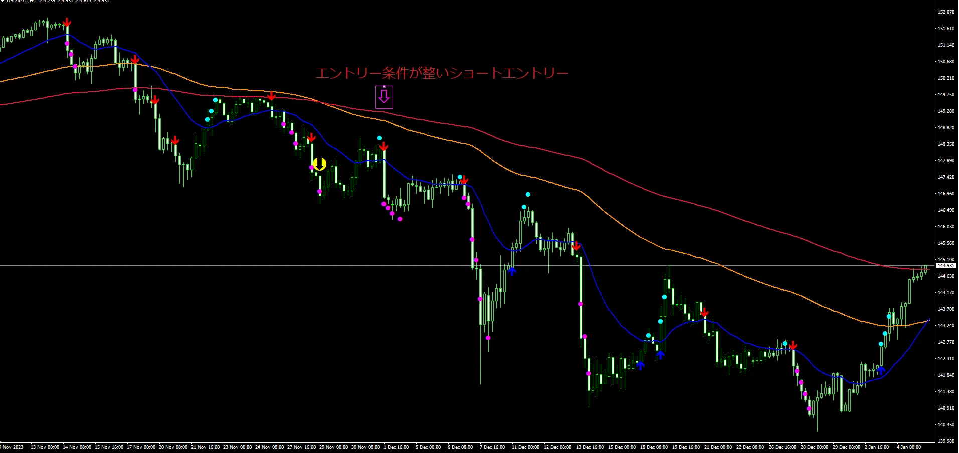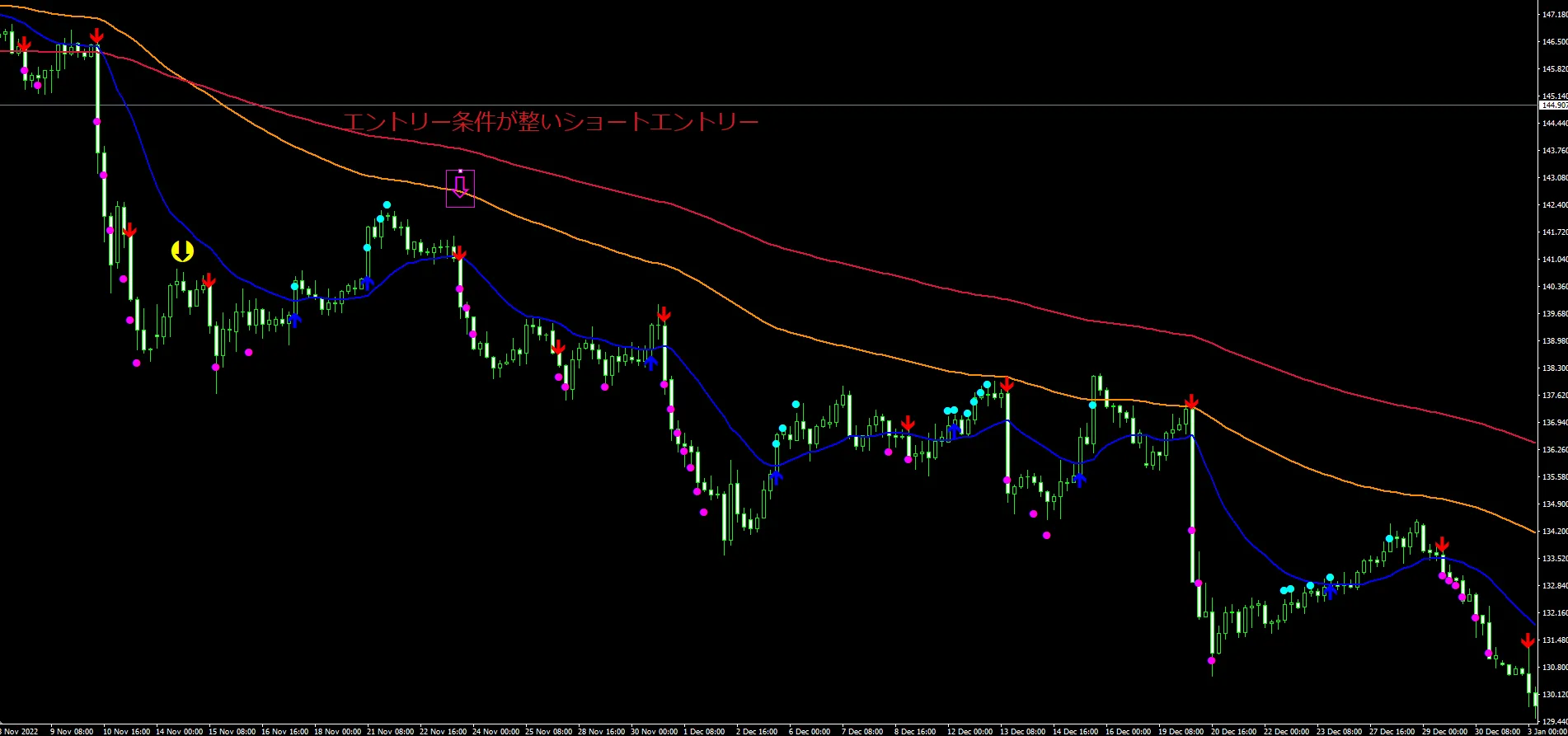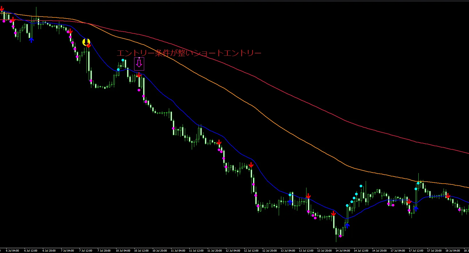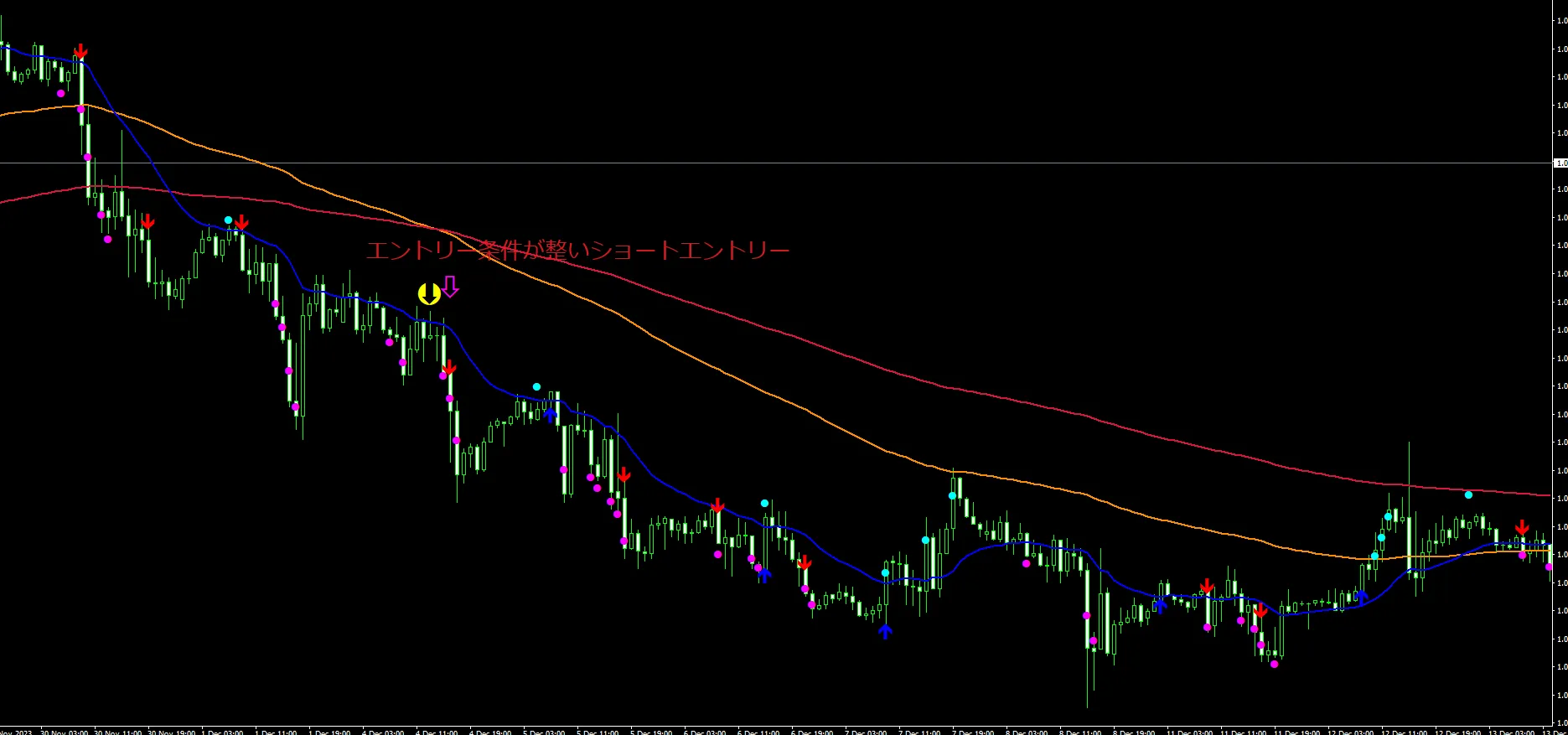 ピンクの中抜き矢印のローソク足でエントリー条件成立