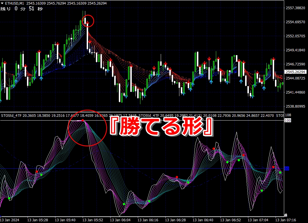 ② 矢印サイン点灯状態で、インジケーターのピンク色の帯が、緑の帯を下からすくい上げるような形状であれば、現在のローソク足が確定する数秒前か確定の直後に1分判定または3分判定でハイエントリーします。